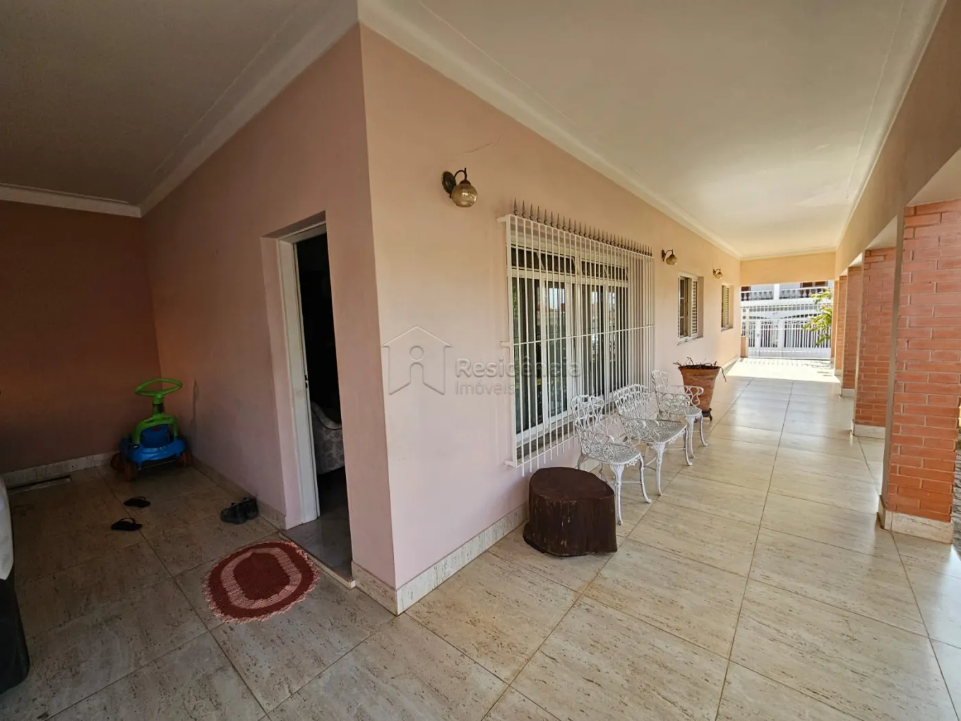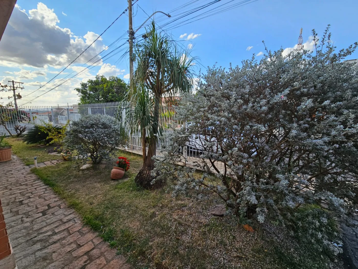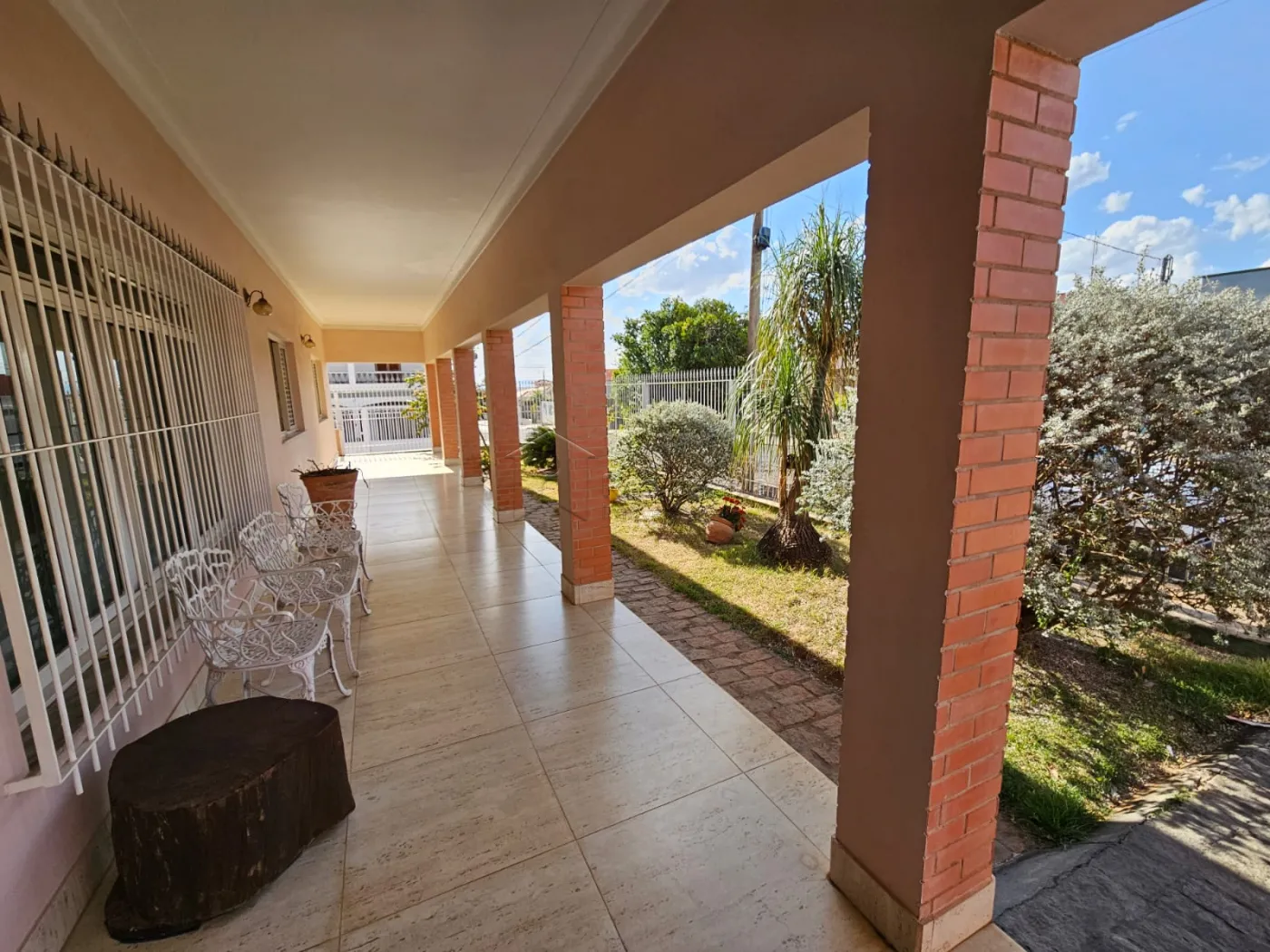 Varanda frontal ampla com um belo jardim.