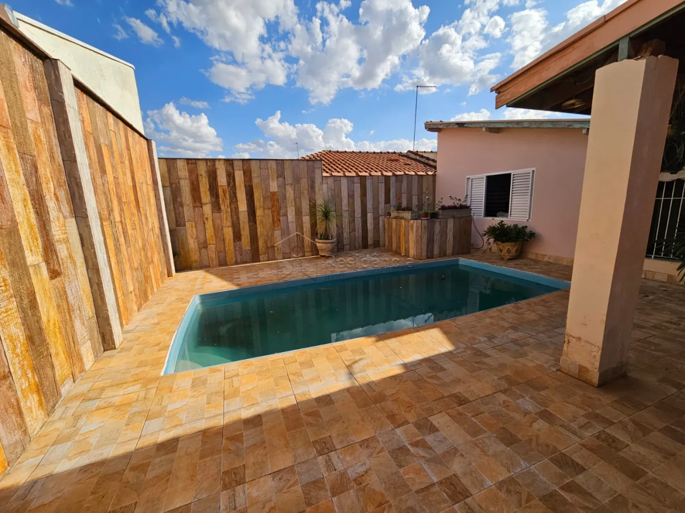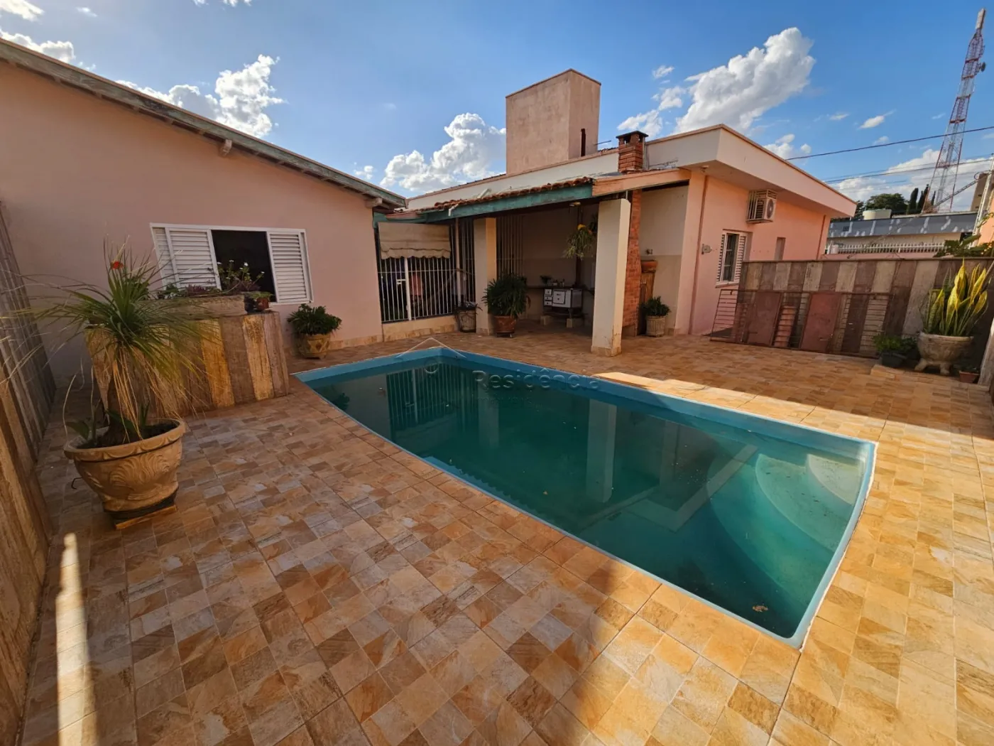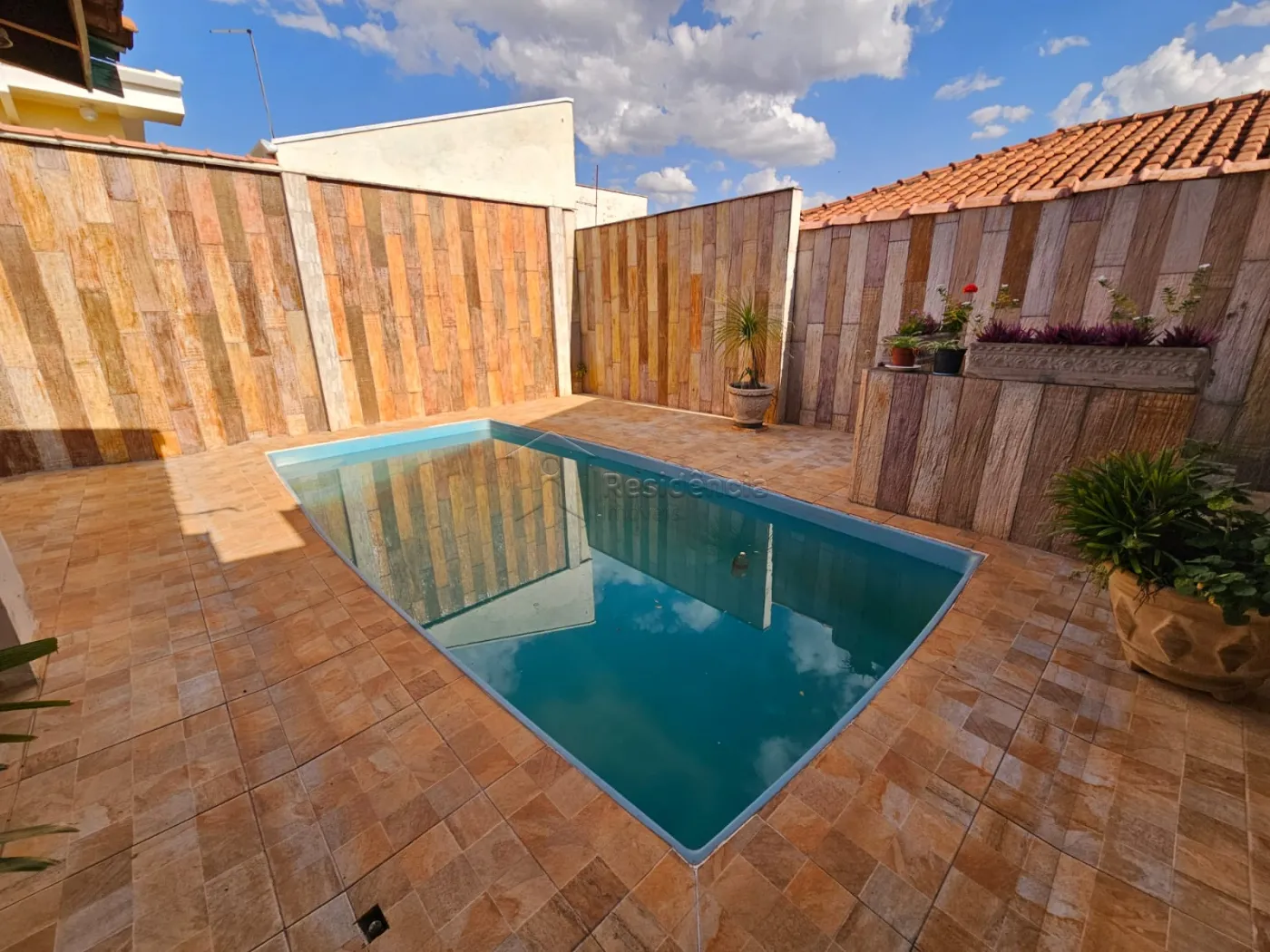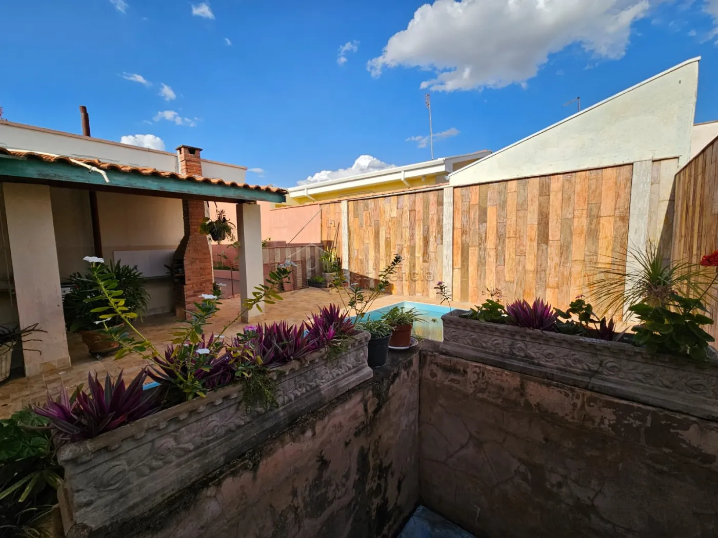 Quintal espaçoso com piscina, churrasqueira de alvenaria e um charmoso pergolado com plantas;