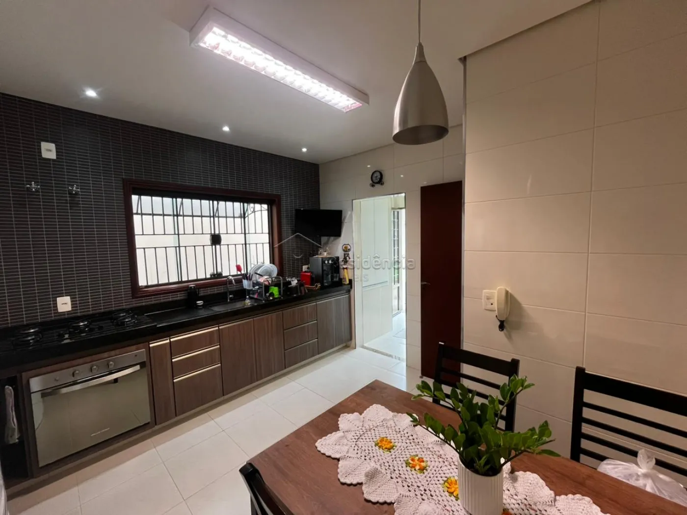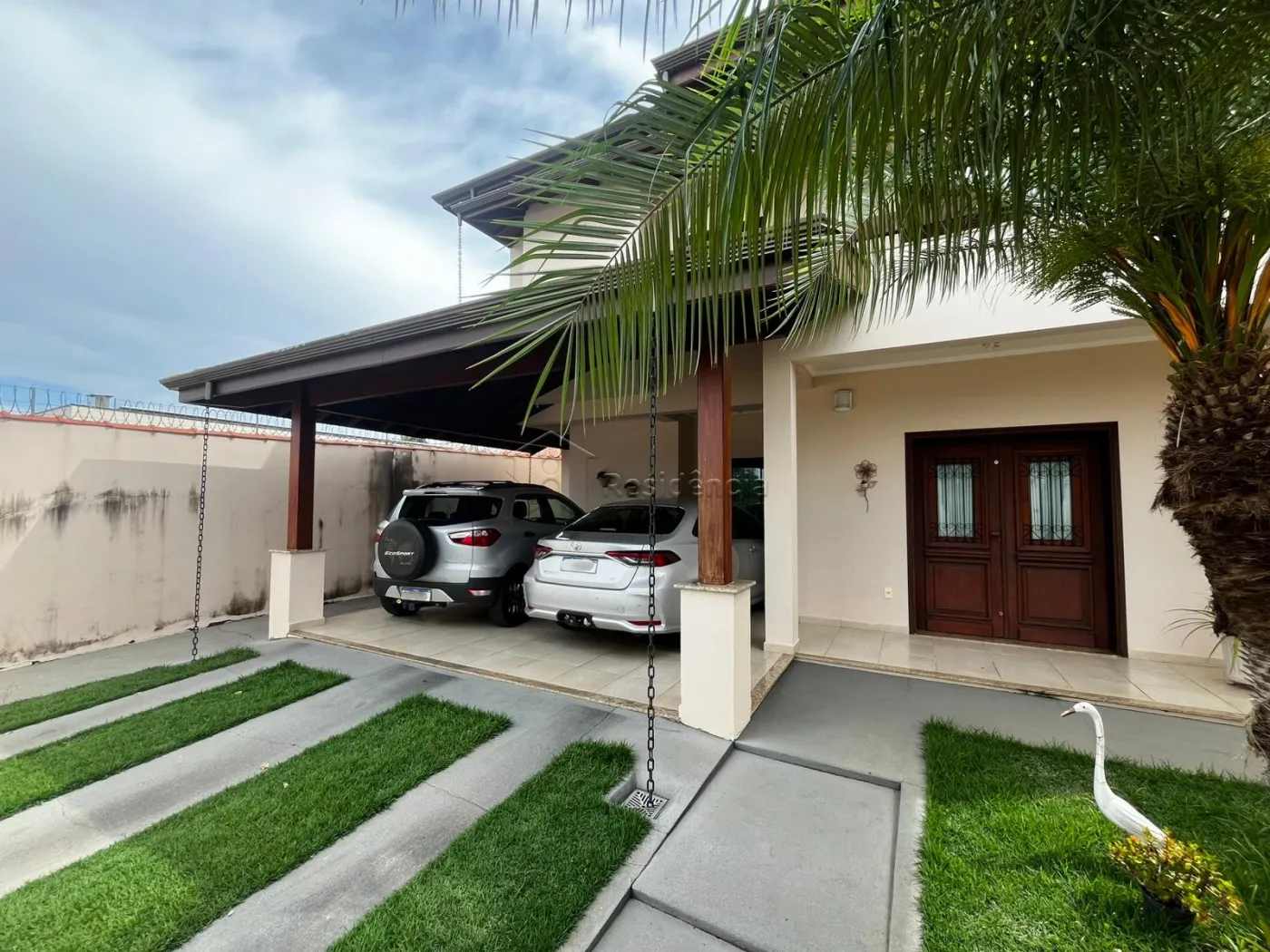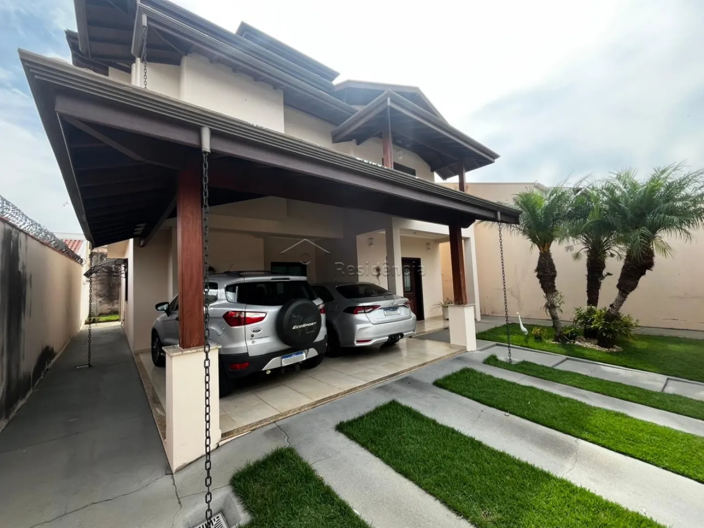A área íntima dispõe de três dormitórios, sendo uma suíte, além de um banheiro social e área de serviço funcional. A residência ainda oferece quatro vagas de garagem, sendo duas cobertas, garantindo praticidade e segurança.