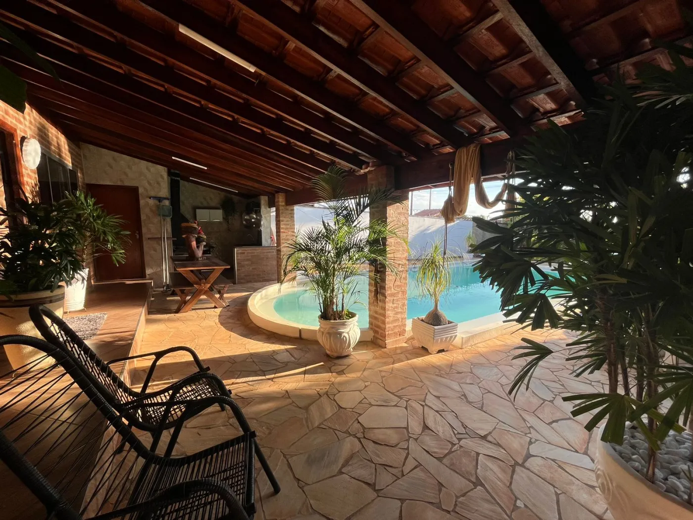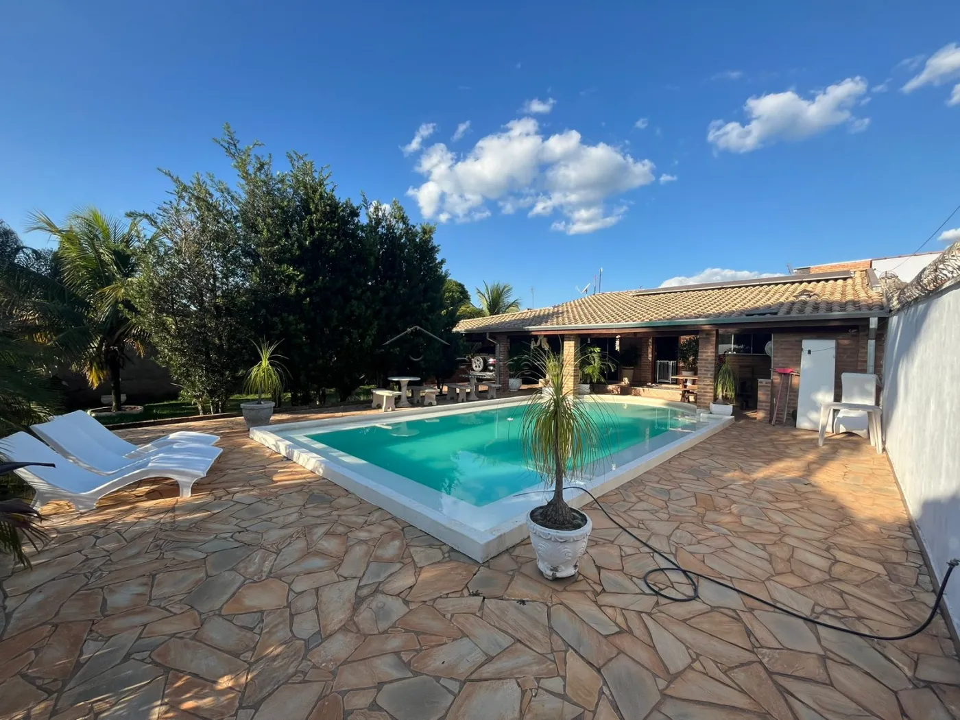 A chácara conta ainda com 02 dormitórios, sendo 01 suíte com closet, sala ampla, copa e cozinha modulados, área de serviços, ateliê, banheiro social e espaço gourmet integrado a piscina.